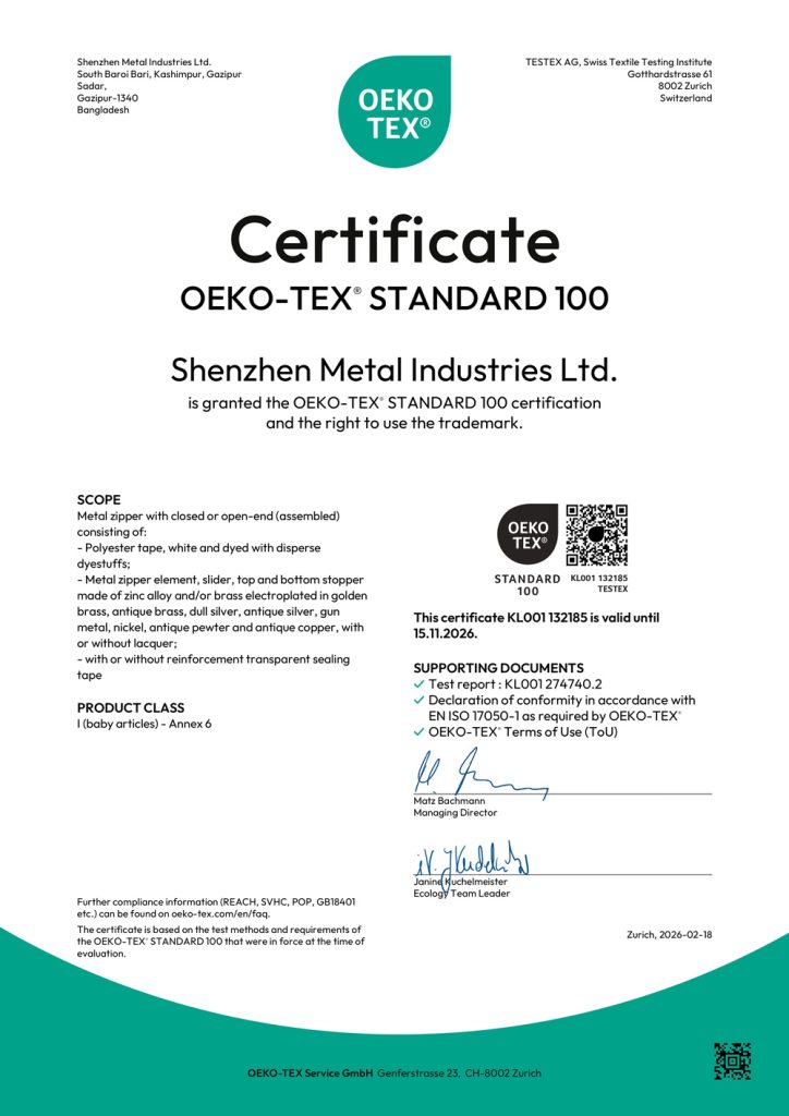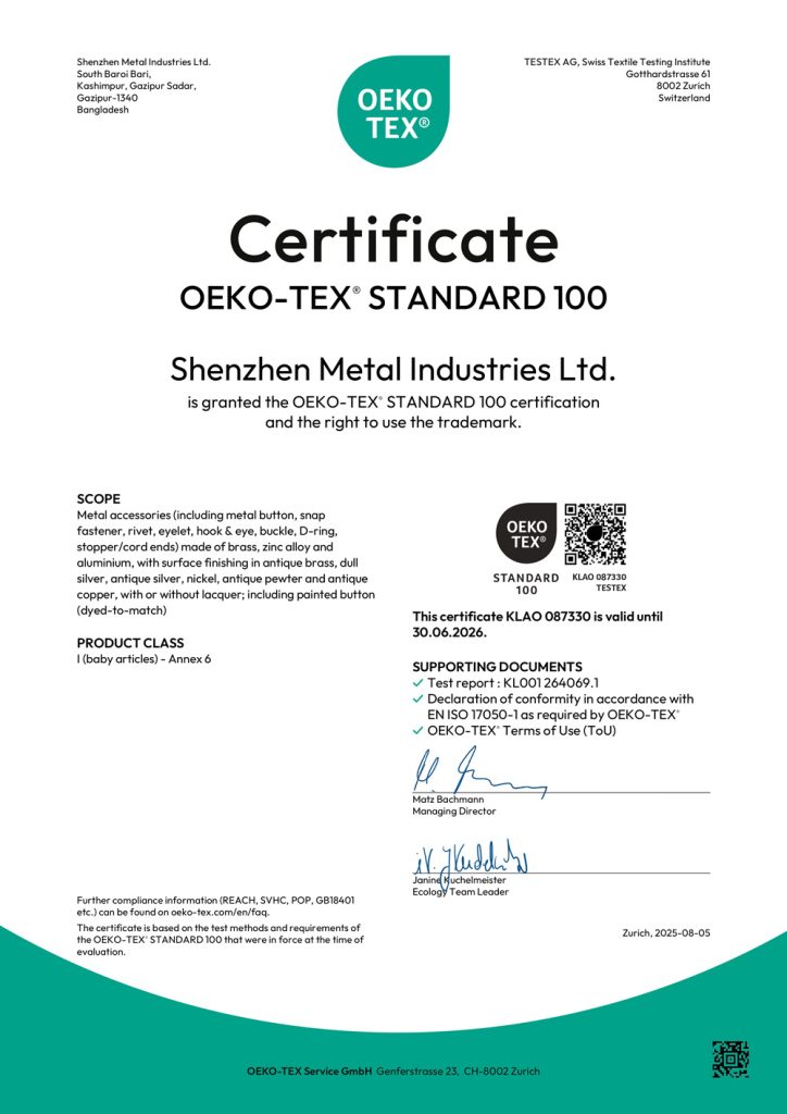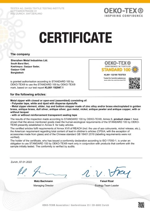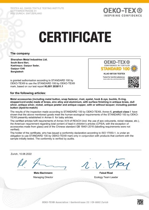 OEKO-TEX® STANDARD 100 is one of the world’s best-known labels for textiles tested for harmful substances. It stands for customer confidence and high product safety. Our Metal accessories (including metal button, snap fastener, rivet, eyelet, hook & eye, buckle, D-ring, stopper/cord ends) made of brass, zinc alloy, and aluminum, with surface finishing in antique brass, dull silver, antique silver, nickel, antique pewter, and antique copper, with or without lacquer; including painted button (dyed-to-match) and Metal zipper with closed or open-end (assembled) are OEKO-TEX Standard 100 certified.